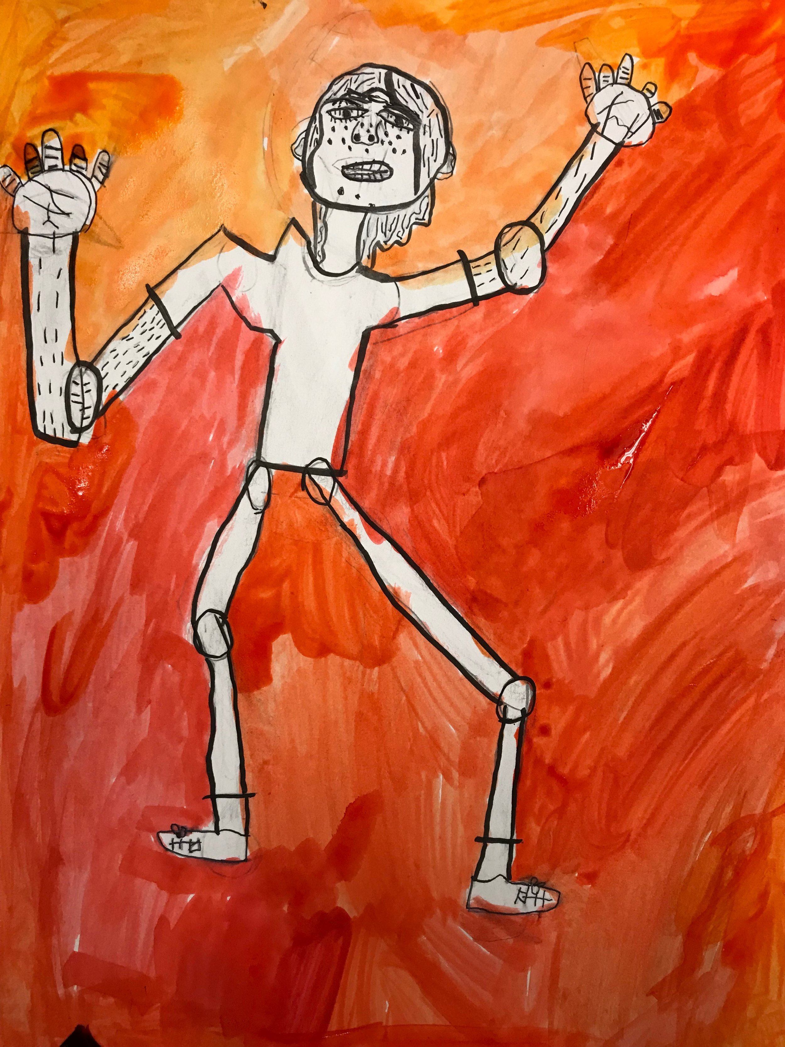 When taught well, self-portraits give our students the opportunity to draw incredible details in their own way. Finished work includes facial features made with tons of different shapes and lines, clothing with small design elements and backgrounds that tell you more about your students’ lives outside the studio. When taught poorly, self-portraits arouse our students’ artistic insecurities evident in the constant “I can’t draw a (fill in the blank with any facial feature)!” Finished work looks cartoonish, simplified, “cute”. It’s evident in this work that students are trying to make their portraits look a certain way instead of focusing on the creative challenge of drawing facial features and body parts.